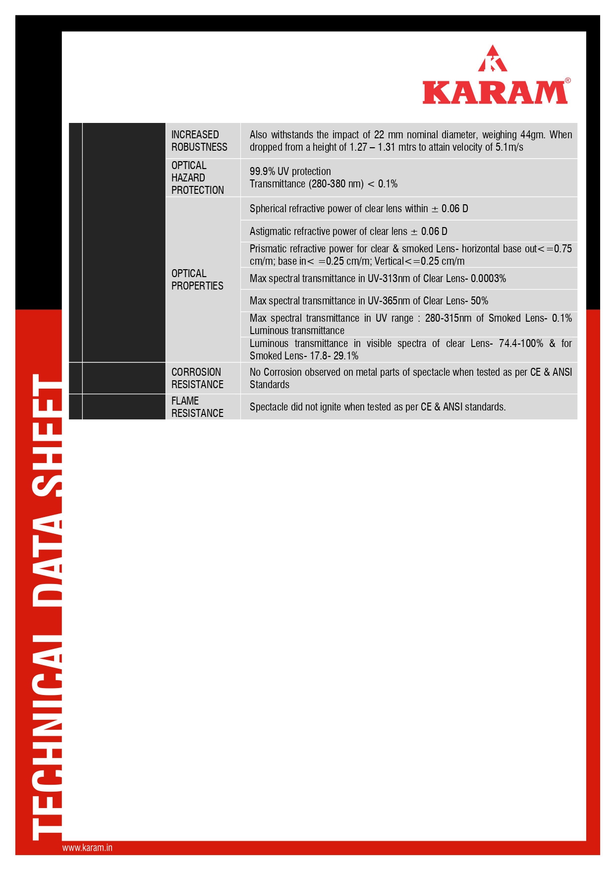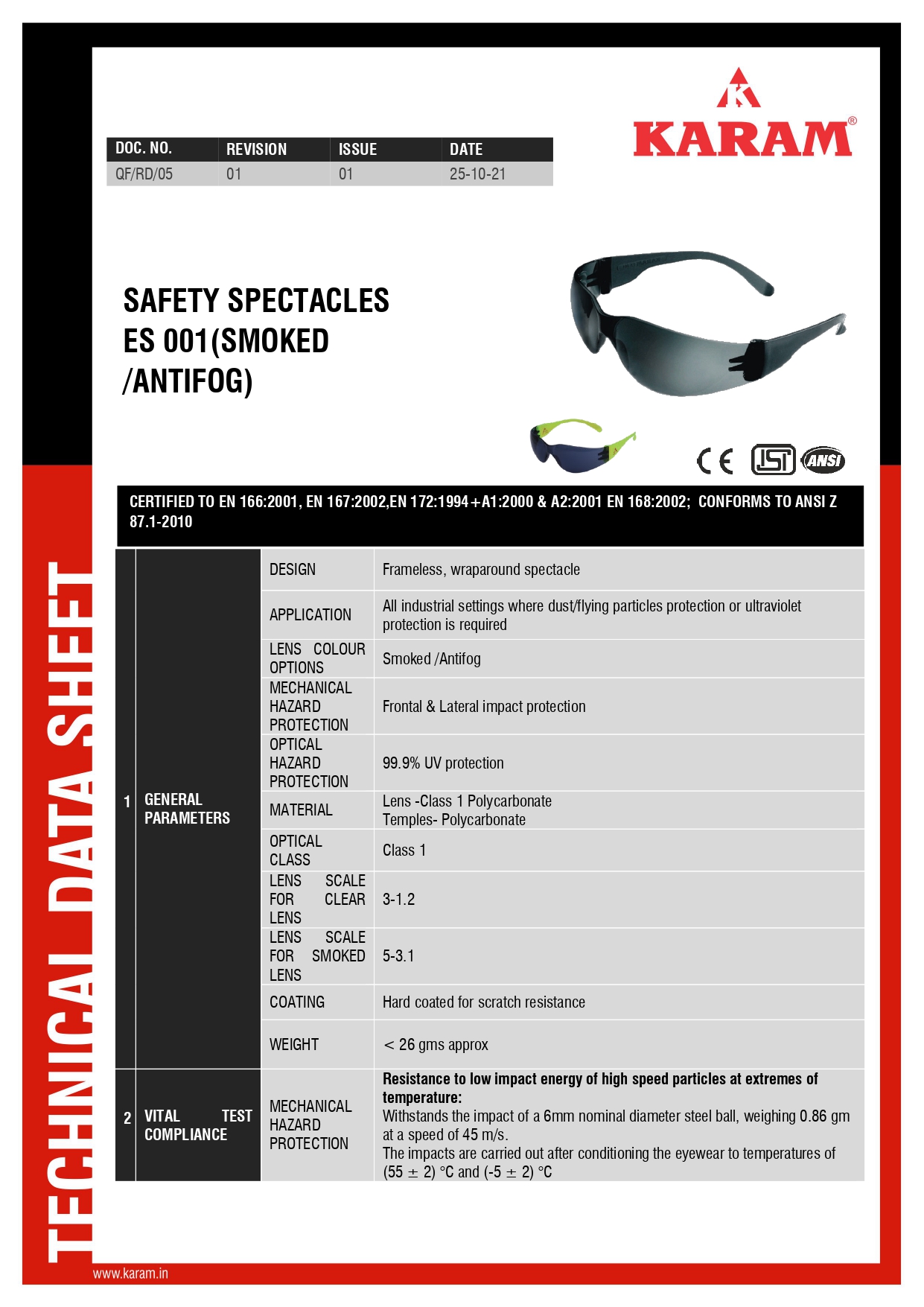 EN 166:2001, EN 167:2002, EN 172:1994+A1:2000 & A2:2001, EN 168:2002, IS 5983:1980, ANSI Z 87.1-2020