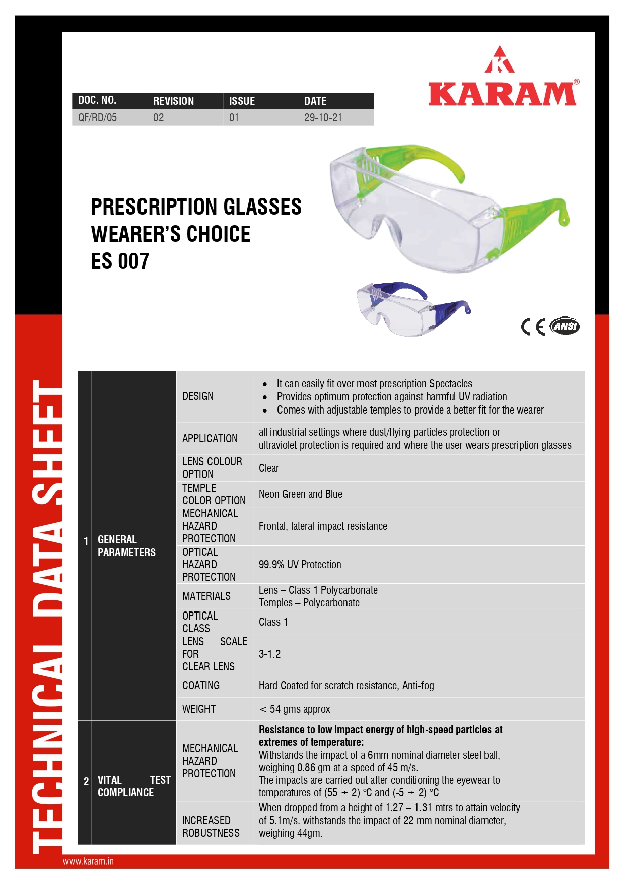 To provide safety to those who cannot directly put on a safety eye wear, as they have to wear prescription spectacles, the ES 007 easily fits over the prescription frames.