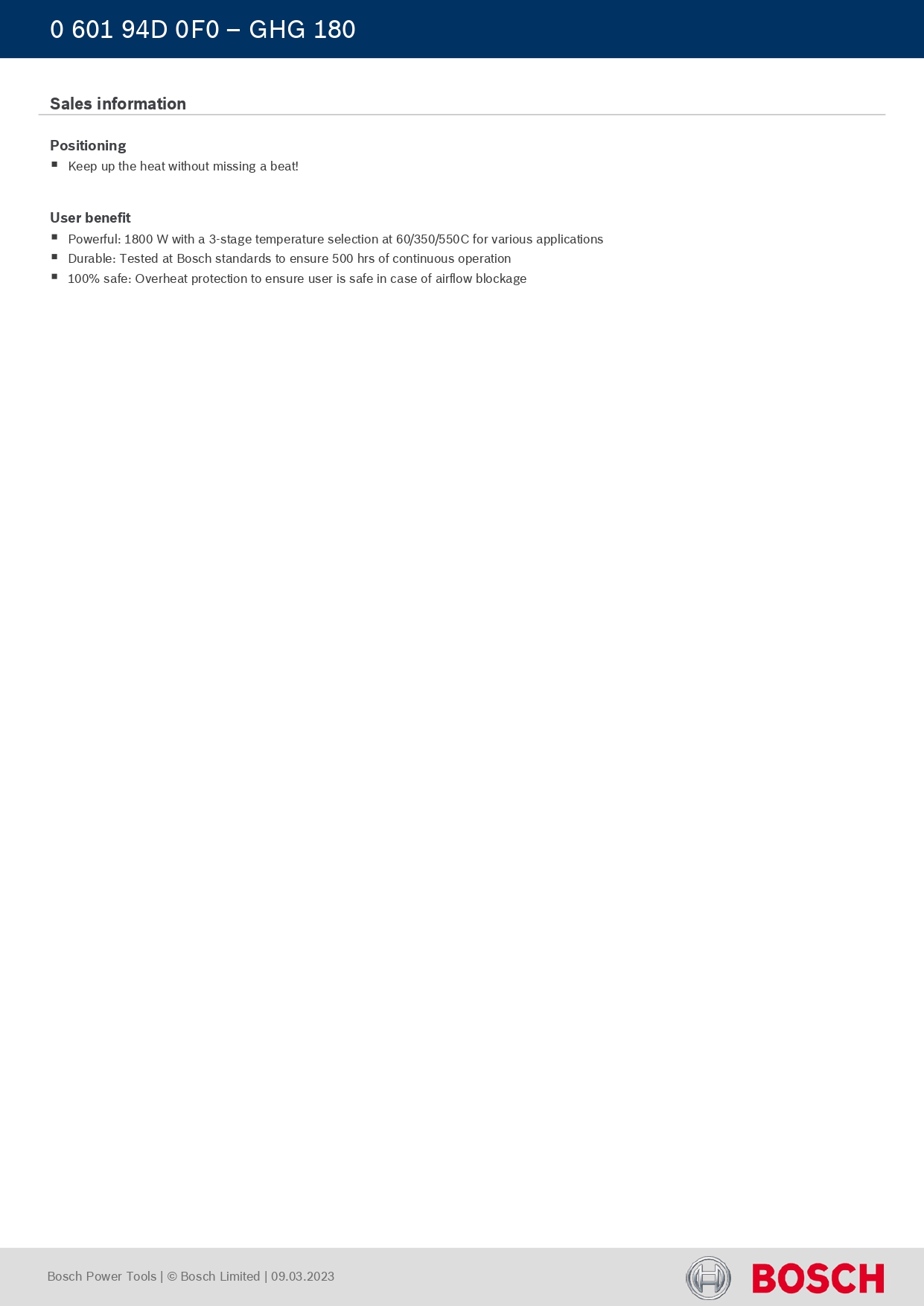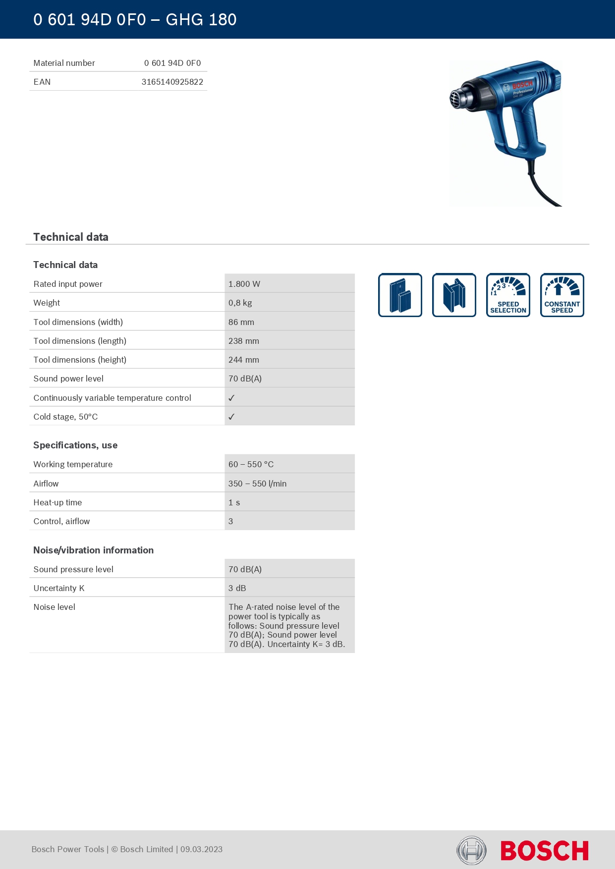 The Bosch GHG 180 (part number 060194D0F0) is an entry-level professional heat gun designed for a wide range of applications that require a powerful stream of hot air. It is known for its durability, user-friendly operation, and safety features.