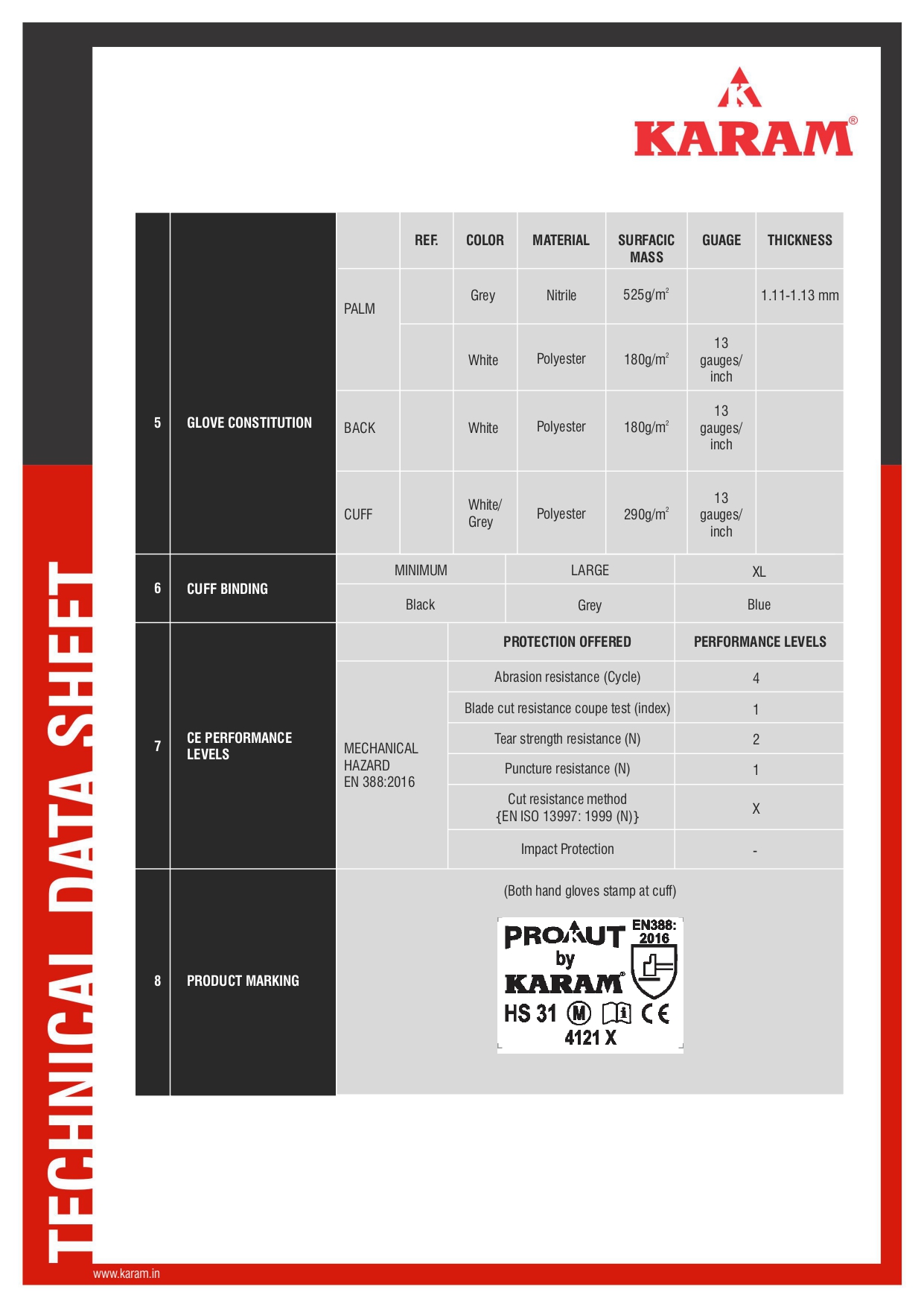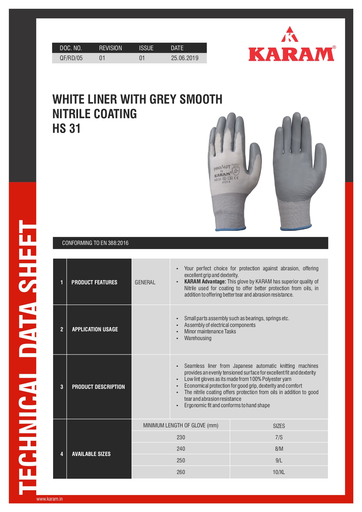 KARAM ProKut HS31 having white liner Polyester Lining with grey nitrile Coating is your best choice for cut protection in automobile industry, with excellent grip. Seamless liner from Automatic Knitting Machines provides an evenly tensioned surface for excellent fit and dexterity. It is offerred in 3 sizes: M, L and XL