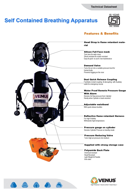 The SCBA features the V-666 full face mask, constructed from heat-resistant neoprene rubber with a wide-view, anti-fog polycarbonate visor. It is capable of withstanding extreme temperatures (up to ~900°C), ensuring visibility and safety even in fire conditions.