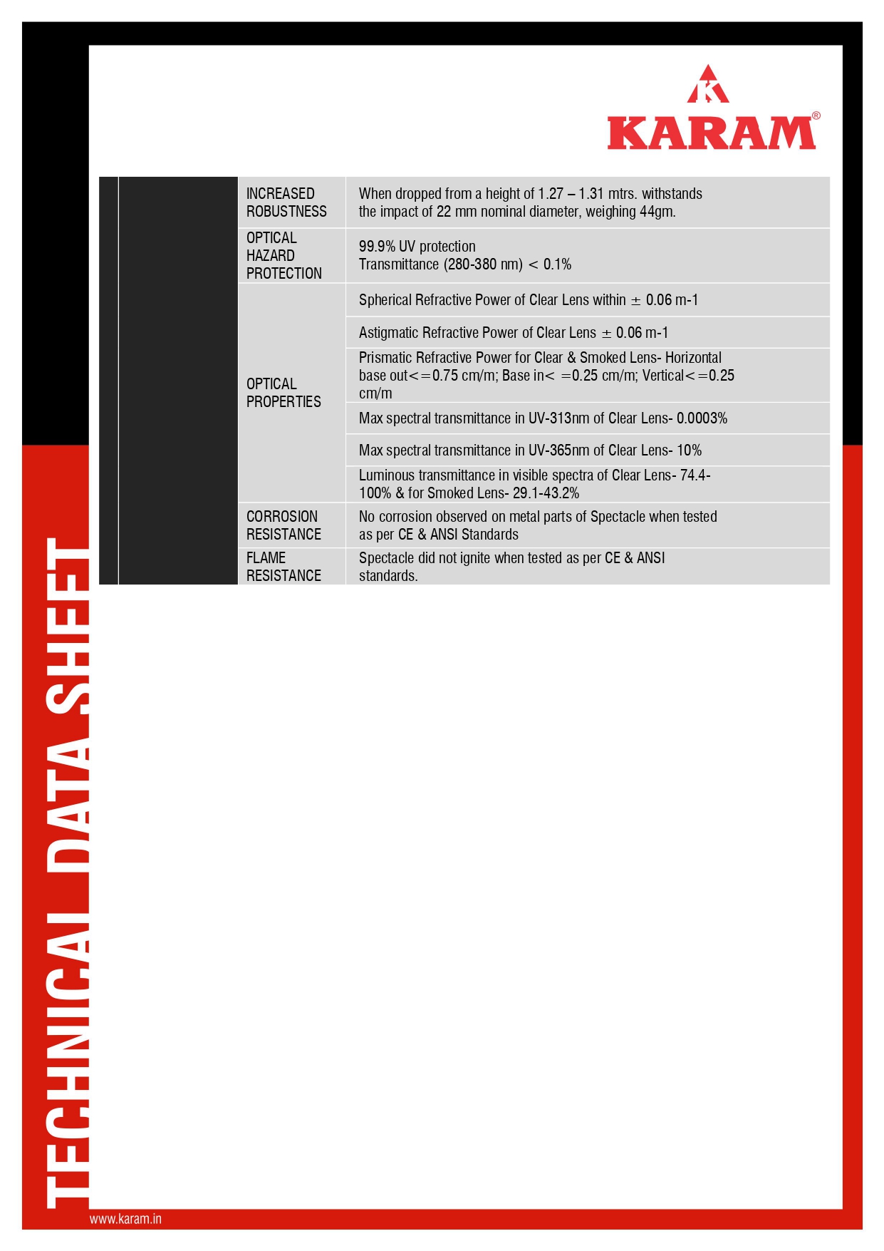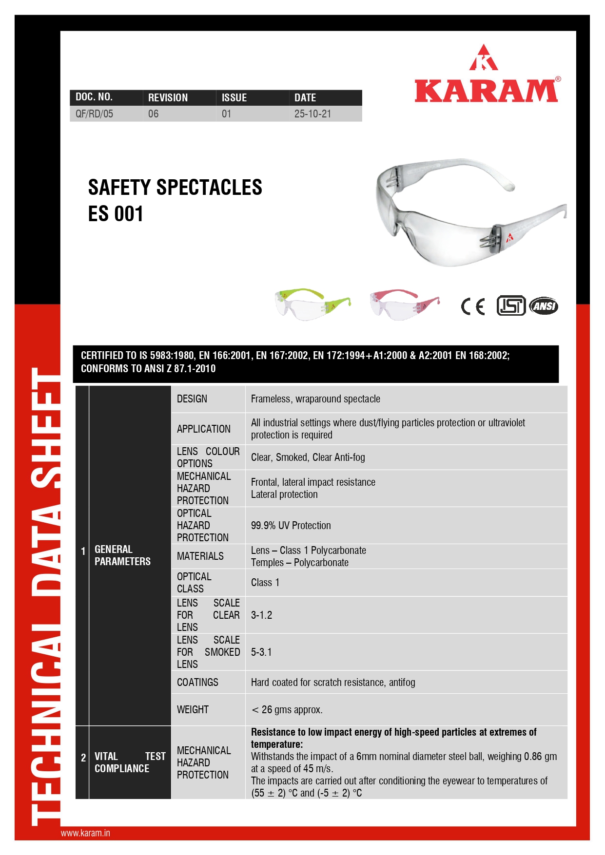 Optically tested, Conforms to EN166:2002, EN 167;2001 & EN 172:1994, EN 168:2001, ANSI 87.1-2010