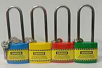 A black LOTO (Lockout/Tagout) padlock is a safety device used in industrial settings to secure machinery during maintenance and prevent accidental start-up. The black color is often used to designate a specific purpose, though the exact meaning can vary by company.