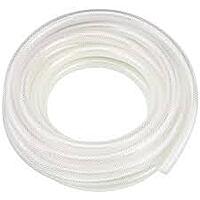A white, braided PVC pipe or hose, with a 1/2-inch diameter, is a flexible hose pipe reinforced with braided synthetic fibers, typically high-tensile polyester yarn. The braided design provides enhanced strength and durability compared to standard, unreinforced PVC tubes, allowing it to withstand higher pressure without collapsing or bursting.