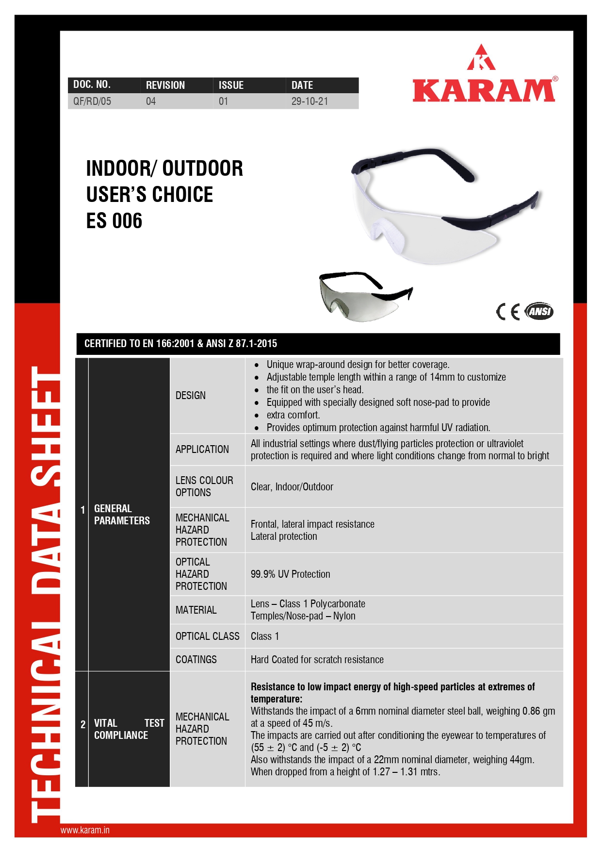 Designed for both Indoor as well as Outdoor usage, and fitted with light mirror-coated lens, the ES 006 is an ultimate symbol of fashion and styling, coupled with complete eye safety.
