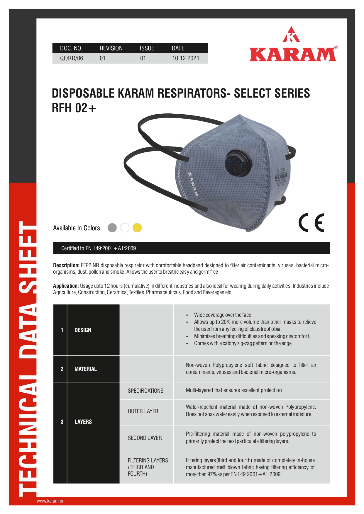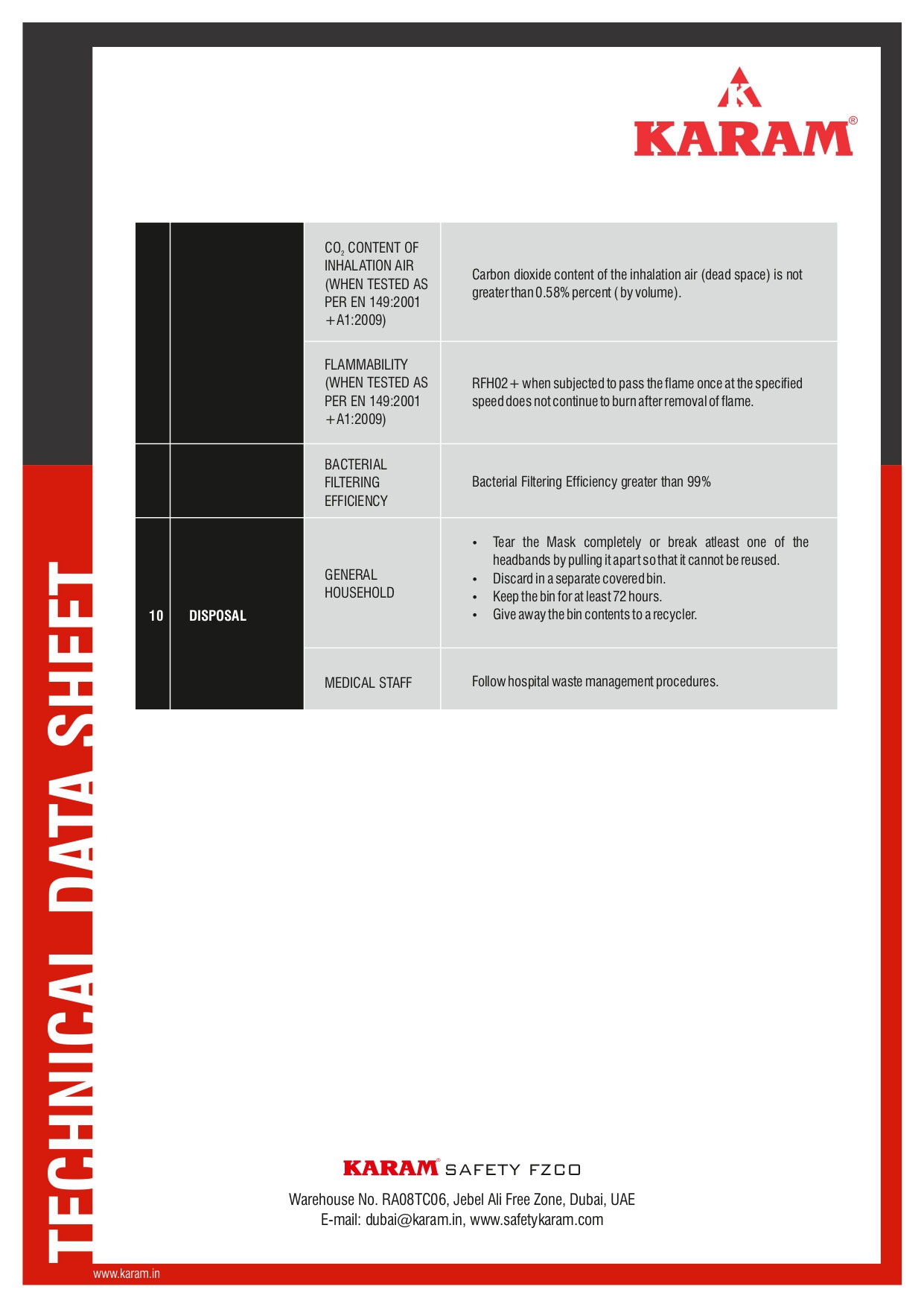 | Flammability (Clause 5.6 of IS 9473:2002) | The face mask when subject to pass the flame once at the specified speed should not continue to burn after removal of flame | KARAM Respirator does not continue to burn after removal of flame |