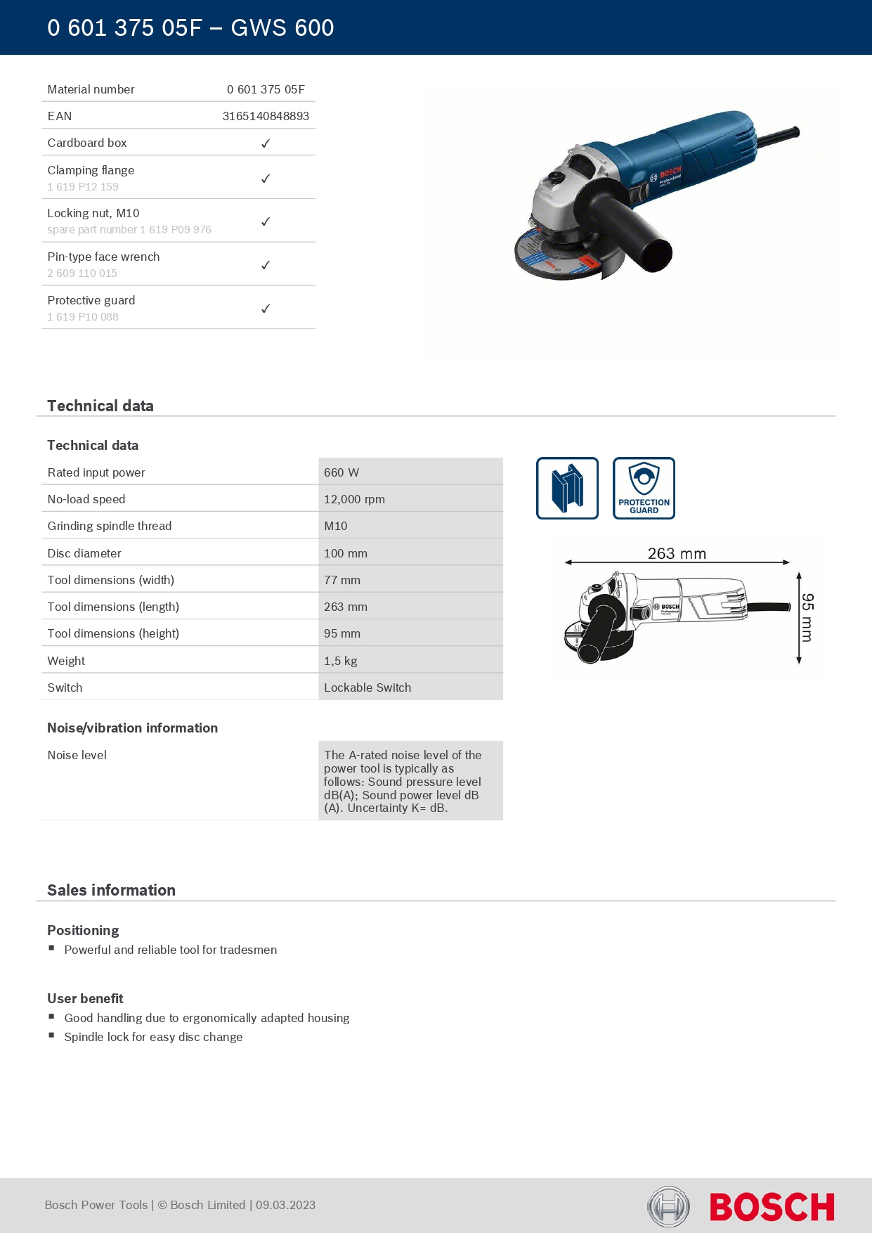 - Package contents: 1 Gws 600 professional angle grinder, Locking nut, M10 , Protective guard, Clamping flange, Pin-type face wrench , Cardboard box.
