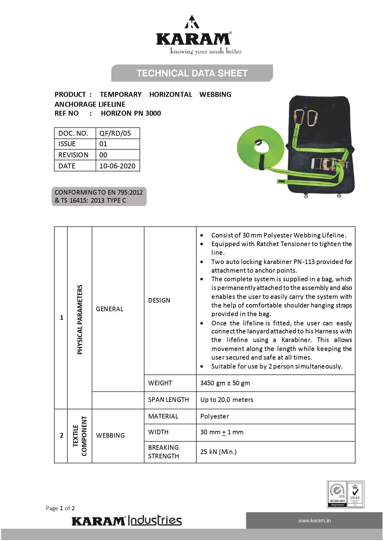 - The horizon PN3000(BC) is a horizontal anchorage lifeline made up of 30mm Polyester webbing equipped the KARAM ratchet tensioner that allows easy tensioning of the lifeline between two structures. Both the ends are provided with auto locking steel karabiners PN113
