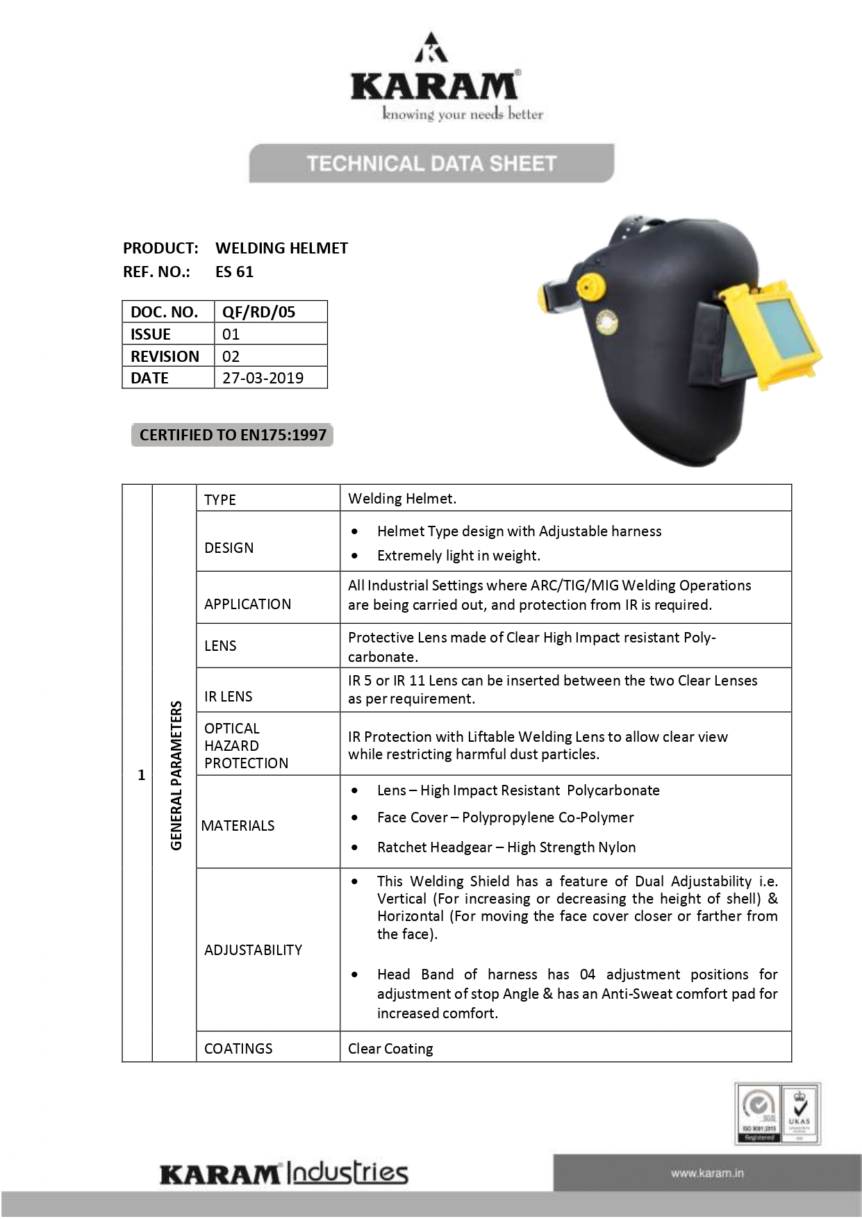 KARAM Welding Helmet Provides complete protection to the user’s face during all kind of welding operations which equipped with a flip-up front window that the user can choose to open when not operating and has removable lens which is tested against E N 175. Headband of the Welding Helmet has 4 adjustment positions and is provided with an anti-sweat comfort pad for increased comfort and Consists of ratchet adjustment for easy harness adjustment that can provide ease of doing work.