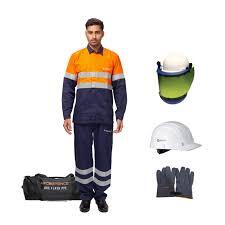 The Arc Defence 8 Cal Electrical Arc Flash Suit is a personal protective equipment (PPE) kit manufactured by Hicare Safety Solutions. The 8 cal/cm\\({}^{2}\\) rating means the suit is certified to protect against thermal energy from an electric arc flash up to 8 calories per square centimeter.