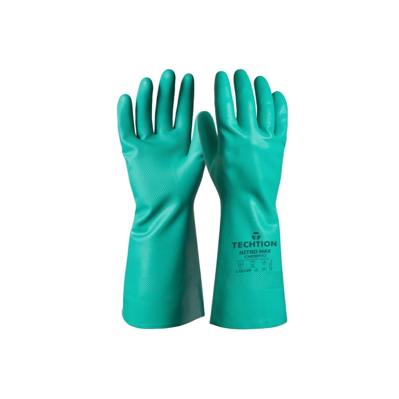 KARAM HS151 (L) Nitro Max Chempro gloves are high-performance chemical-resistant gloves designed for heavy-duty industrial applications. Made with a premium nitrile coating, these gloves provide excellent protection against a wide range of chemicals including acids, alkalis, oils, and solvents, ensuring safe handling in hazardous environments.